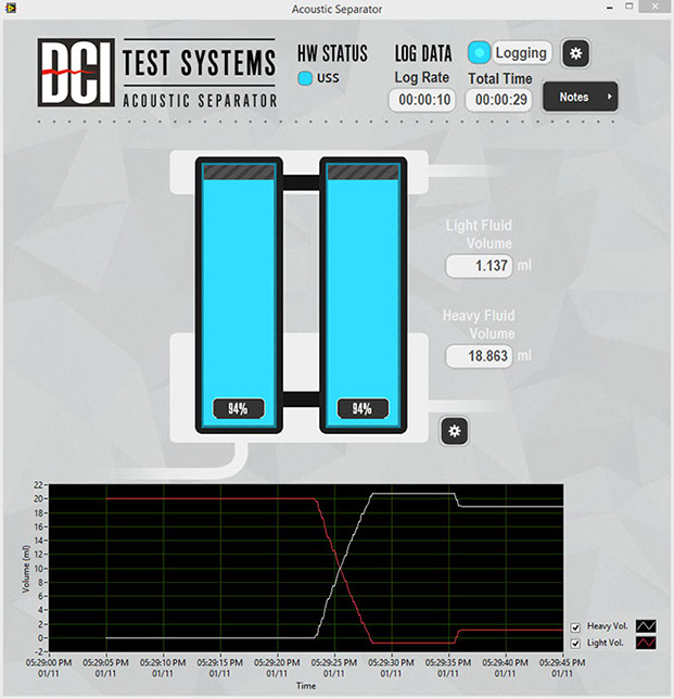 Software for the two phase separator is provided with every unit and displays the volume of the lower density fluid as well as graphical representation of fluid levels inside the cylinders. The acoustic separator software is easily integrated into more complex systems such as core flooding programs to keep track of produced fluids and saturation state.
