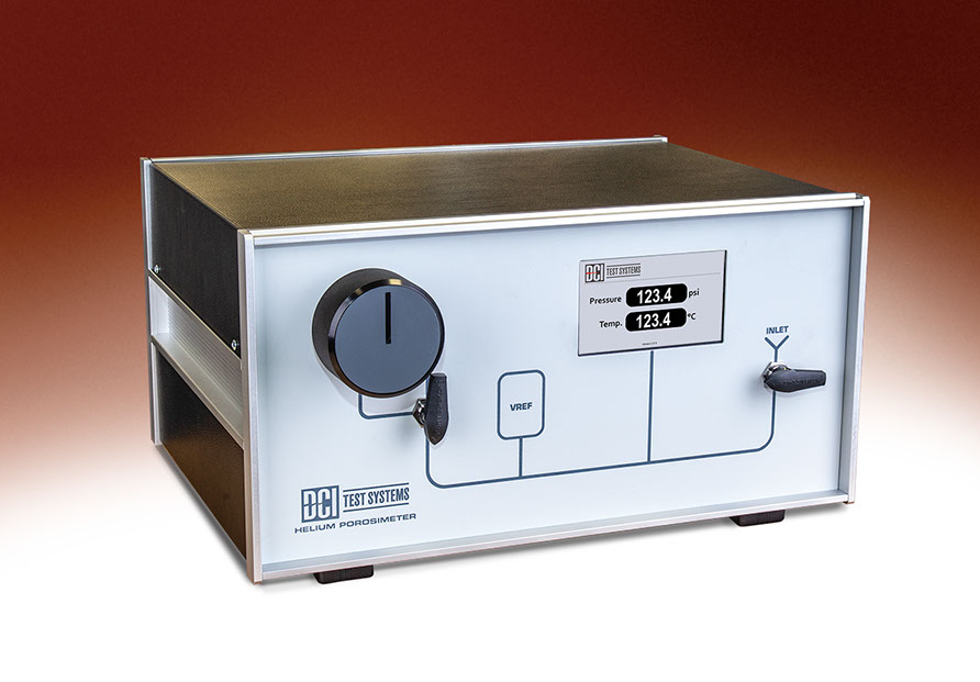 The benchtop compact design of the helium porosimeter consist of sample chamber, reference volume, isolation valves, precision pressure transducer with digital display, and thermocouple with digital display. This device is capable of making measurement on various sized core samples.
