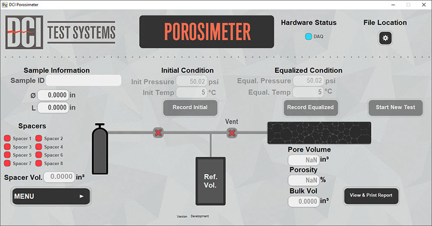 Easily generate a printable porosity report for all your test samples by simply connecting the unit to an available computer and loading the DCI Porosimeter Software. This software makes it easy to record information in a 3 step process. After collecting the initial condition and equalized conditions, the software calculates sample porosity. The software is designed so each step must be completed before the next step can be started. Multiple core samples can be measured on a single report.