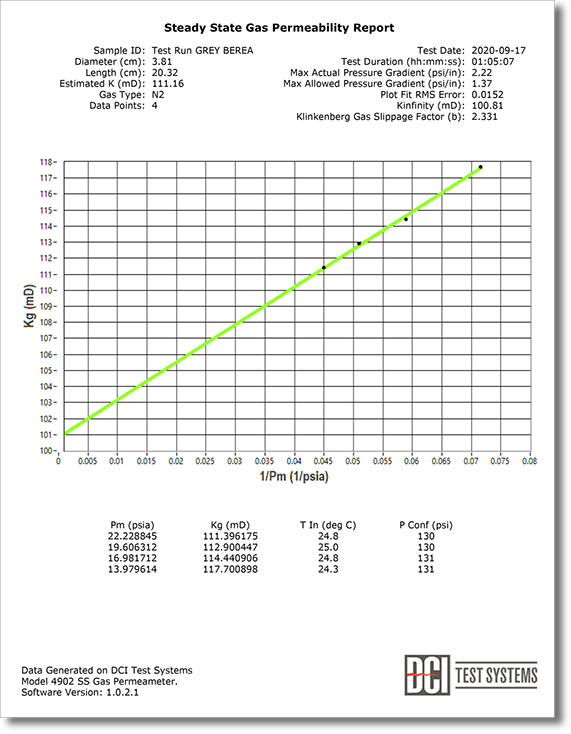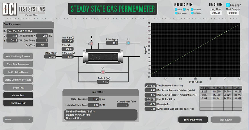 The software automates the test, and only require a few basic parameters about the sample. Once the software is started, the program will proceed through the different steps automatically. The data is saved in both spreadsheet and report formats for easy review. The user can have the software run single point or multiple point Klinkenberg correction permeability tests. The maximum pressure gradient and different pressure steps are all automatically calculated and run. The software allows for flow stabilization and checks for steady state before recording a point.